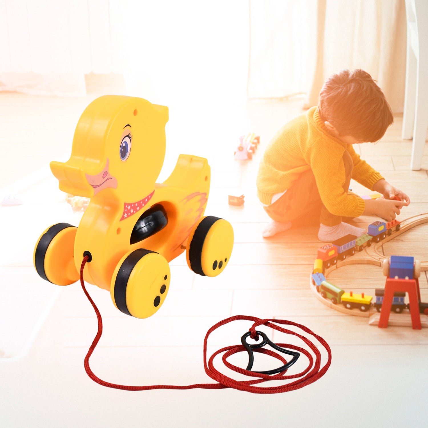 Delight your little one with this adorable Pull Along Duck Toy, specially designed for 1-year-old boys and girls. With its vibrant colors, smooth wheels, and waddling motion, this toy encourages toddlers to walk, improving their balance and motor skills. The friendly duck design sparks curiosity and imaginative play while helping develop coordination and muscle strength. Made with child-safe materials, it?s the stylish early development companion for curious explorers.